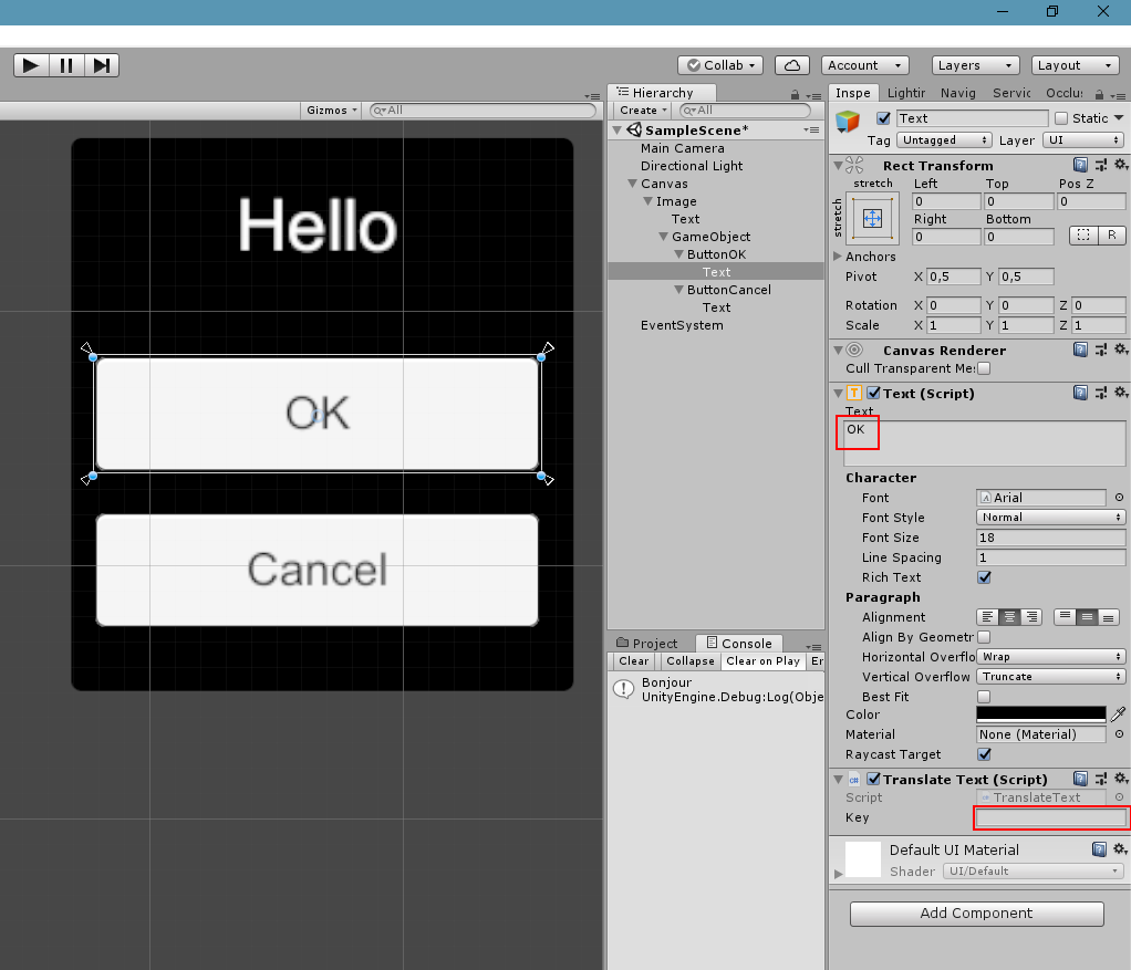 Sont fonctionnement est on ne peut plus simple, il suffit de l’ajouter sur tous les GameObjects de type UnityEngine.UI.Text et la traduction sera automatique. Si le champ de texte à déjà une valeur et que la clé de traduction est vide, alors le code essayera d’utiliser cette valeur comme clé de traduction, sinon la clé de traduction donnée sera utilisée. Vous pouvez modifier le code pour une prise en charge de TextMeshPro aussi 😉