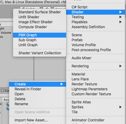 On va commencer par créer un cube, puis un nouveau material, que l’on va mettre sur ce cube. De là faites un clic droit dans l’explorateur d’assets Create > Shader > PBR Graph, pour créer votre premier shader avec ShaderGraph.