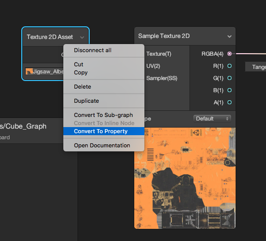 Pour cela rien de plus simple, faites un clic droit sur le noeud Texture 2D Asset, puis faites Convert To Property. La propriété apparait désormais sur le blackboard à votre gauche. Vous pouvez la renommer, choisir une valeur par défaut, etc…
