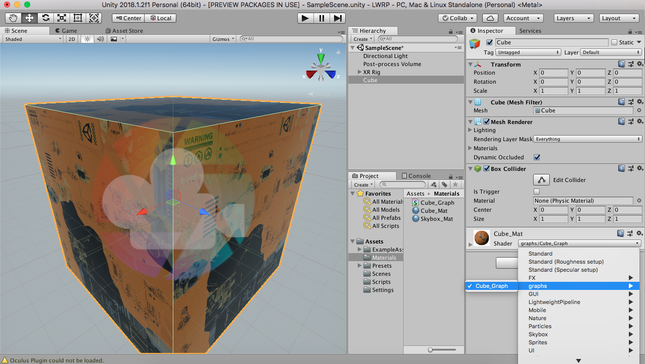 Maintenant que tout est configuré, vous allez pouvoir profiter de toute la puissance d’Unity 2018. Sachez que vous n’êtes pas obligé d’utiliser ShaderGraph, vous pouvez utiliser les Shaders livrés avec le Lightweight Render Pipeline. De même, vous n’avez pas à créer un shader par material, ne tomber pas dans le piège que certains font avec d’autres moteursL’idée est de créer un shader qui répond à un besoin et de le réutiliser !