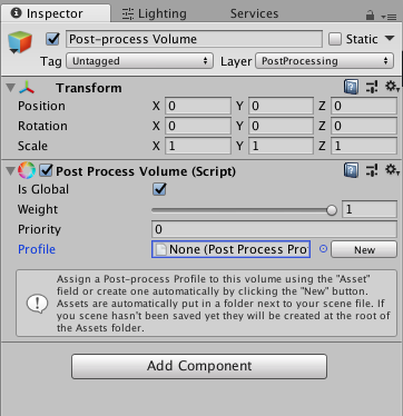 Maintenant nous allons créer un GameObject vide sur la scène et y attacher un script PostProcess Volume. Changez le Layer du GameObject et mettez le sur PostProcessing. Vous êtes maintenant prêt à ajouter les effets qui rendront votre scène encore plus vivante.