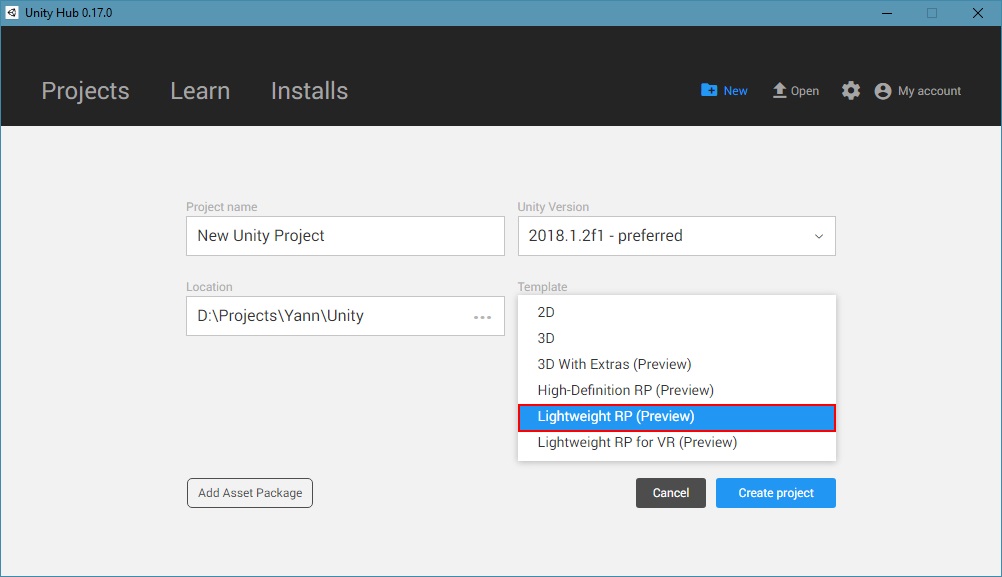 Il y a plusieurs manières d’installer le Lightweight Render Pipeline, la façon la plus simple et de passer par la création d’un projet grâce au nouveaux templates. Il est aussi possible d’ajouter de l’ajouter à la main (github) ou depuis le gestionnaire de paquet embarqué.