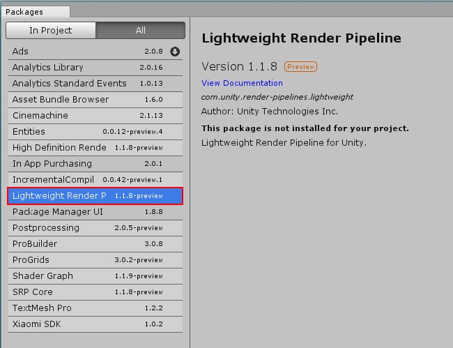 Il est tout à fait possible d’installer le Lightweight SRP sur un projet existant. Pour cela il suffit d’ouvrir le package manager et de sélectionner le package Lightweight Render Pipeline. Depuis le menu Window > Package Manager, sur l’onglet All. Il n’est pas nécessaire d’ajouter les package Shader Graph ou Post Processing car ils sont automatiquement ajoutés avec le Lightweight Render Pipeline. Vous pouvez cependant les ajouter quand mêmes, vous aurez ainsi un contrôle sur la version que vous utilisez.