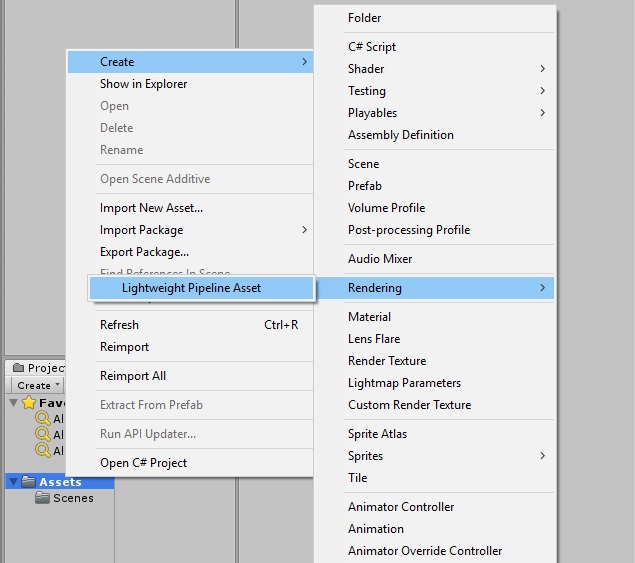 Une fois ajouté, le Lightweight Render Pipeline n’est pas pour autant actif ! Il y a 2 voir 3/4 étapes supplémentaires. La première chose est de créer un Lightweight Render Pipeline Asset. Pour se faire, faites un clic droit le dossier Assets et sélectionnez Create > Rendering > Lightweight Pipeline Asset.