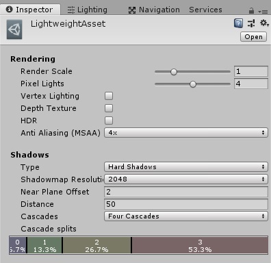 Les paramètres du Lightweight Pipeline Asset